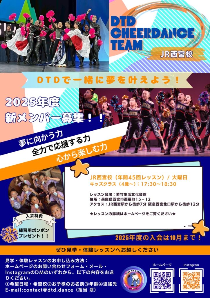 DTD CHEERDANCE TEAMでは、JR西宮校以外にも関西の各エリアでクラスを開講しています。