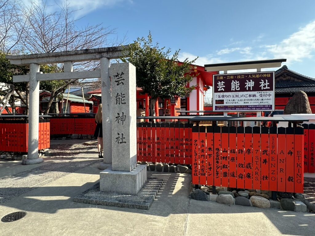 エンタメ界で活躍するさまざまな方々が奉納した玉垣が並んでいます。
