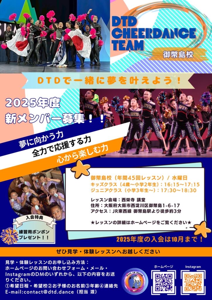 DTD CHEERDANCE TEAMでは、御幣島校以外にも関西の各エリアでクラスを開講しています。